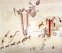 The shades of yellow in my work are ferric oxide, sienna ochre and the shades of reds are made of iron oxide ochre. I make my own inks from the gall of mesquite and oak trees to make black pigment ink for lines and details.